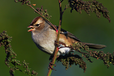 White-crowned Sparrows are becoming more numerous, which is a sign that's it's just about the right time for Harris's Sparrow. The juvenile white-crowneds lack the black and white crest the adults have, but their size and shape gives their identity away.