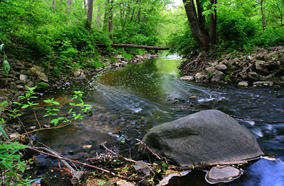 Actually, it's surrounded by city. As shown here, there's often a little bit of photographer's subjective framing that makes the Pheasant Branch creek corridor appear to be a remote stream in the middle of some faraway exotic jungle. Though no hint can be seen in these photographs, one of Middleton's busiest streets is just a few dozen yards downstream. To the right is an apartment building and restaurant, which is now somewhat obstructed by a growing wall of green foliage.